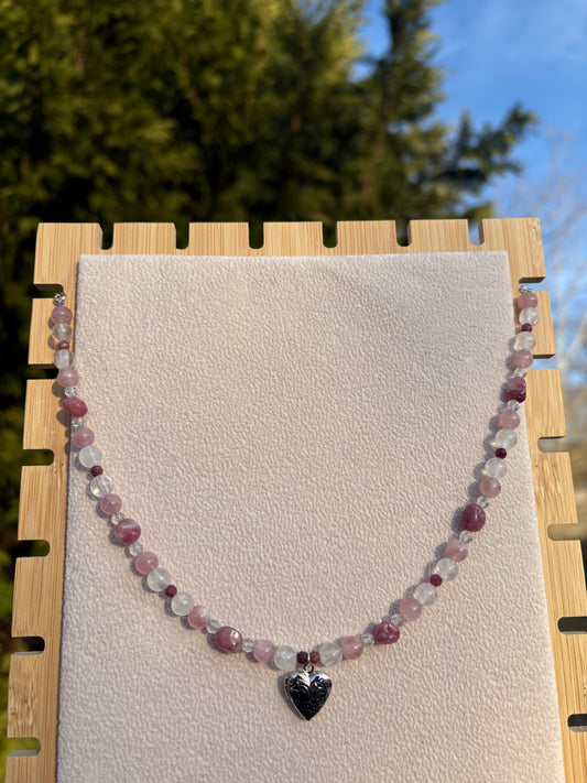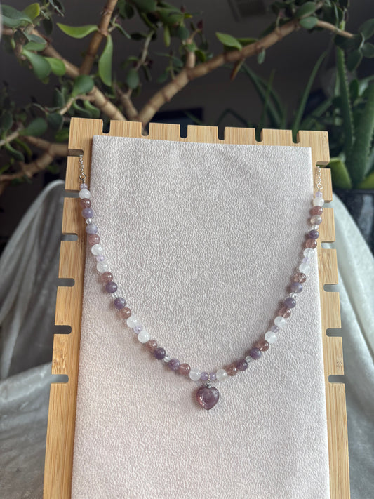 Lepidolite, Strawberry Quartz, White Jade, Topaz & Amethyst Cupid’s necklace