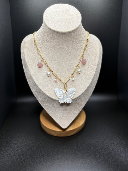 Queen Conch Shell, Rose Quartz, Freshwater Pearl, and Mother of Pearl 18k Gold charm necklace