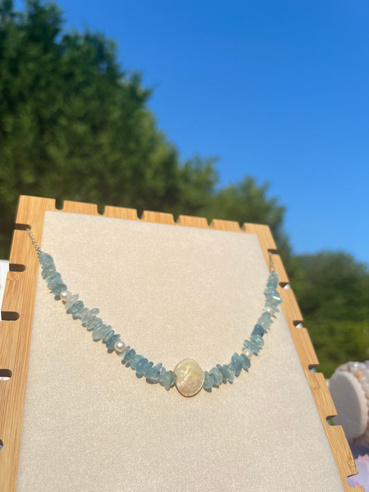 Aquamarine & Freshwater Pearl & Mother of Pearl necklace