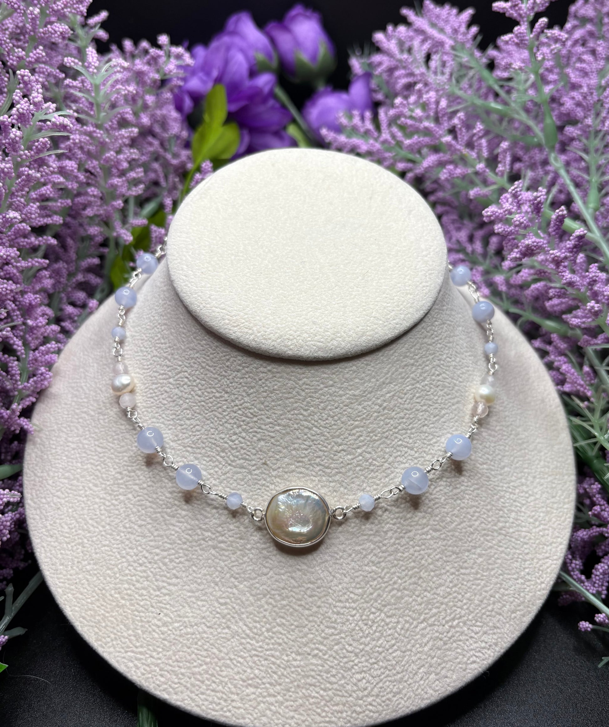 Blue Lace Agate, Rose Quartz, and Freshwater Pearl necklace