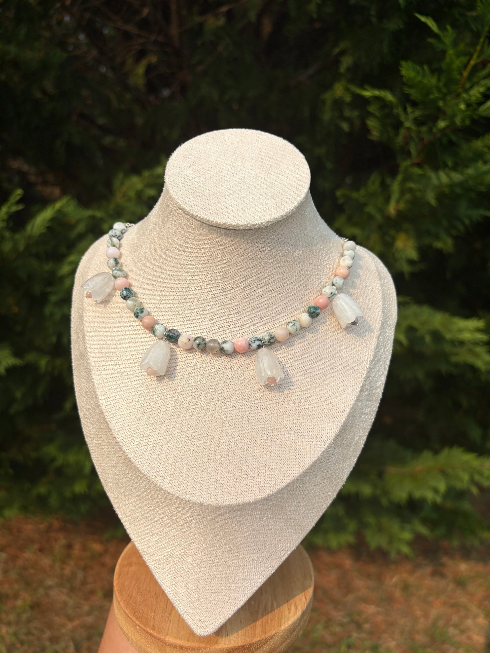 Moss Agate & Peruvian Pink Opal & White Quartz flower necklace