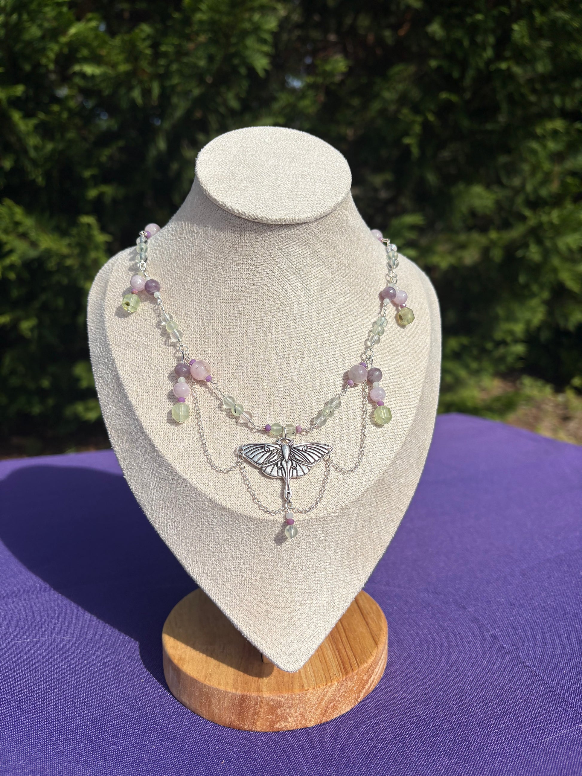 Burmese Jade, Prehnite, Kunzite, Phosphosiderite, Fluorite, and Lepidolite Moth Necklace