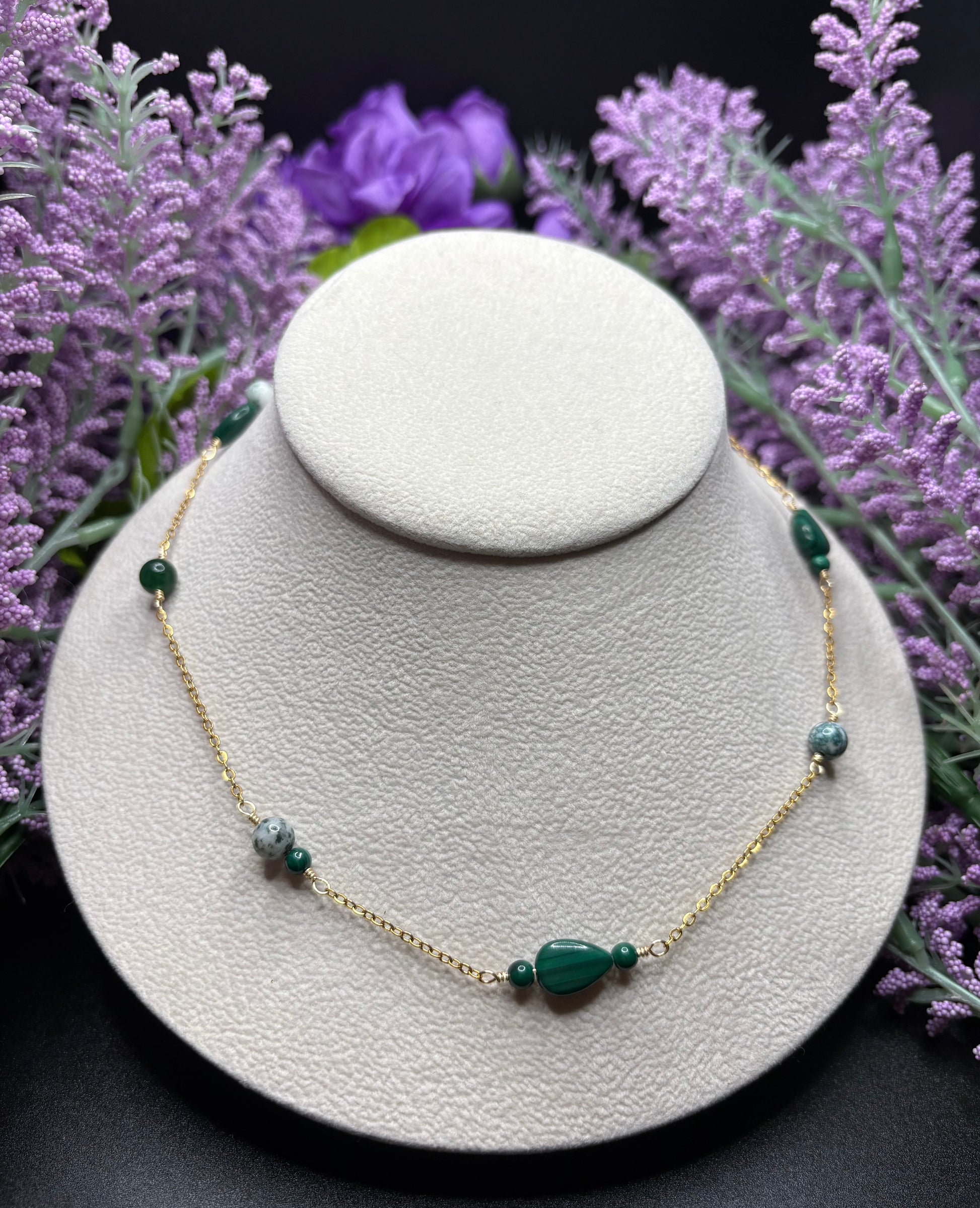 Malachite, Moss Agate, and Muscovite asymmetrical necklace